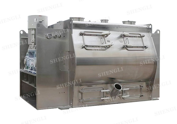 无重力混合机装载着两根同时异向向外旋转的平行桨叶轴,每根轴上搭载十字桨叶,在驱动装置的同步作用下,两根的十字桨叶轴的运行轨迹成相交关系,且错位啮合。驱动装置驱使桨叶轴快速旋转,旋转的桨叶产生离心力,将物料有效抛洒至筒内上空部分,达到抛物线的最高点后下落(抛物线的最高点也称为瞬间无重力状态),物料再受桨叶的驱赶,在筒体内往复循环混合,并受双轴的啮合空间混合、剪切、分离,致使物料快速混合均匀。